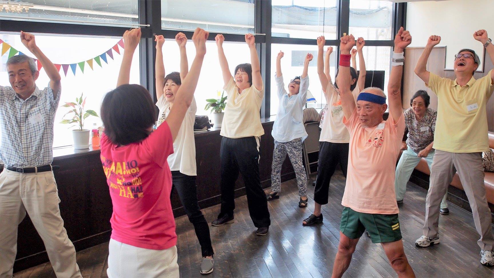 現在20代女性から86歳の男性の方まで幅広い年代の方と一緒に笑っています。年齢、性別を超えてできる健康体操。若い方がシニアの方の元気さに驚き、シニアの方が若い方と同じ体操ができることに楽しさを感じてくださっています。