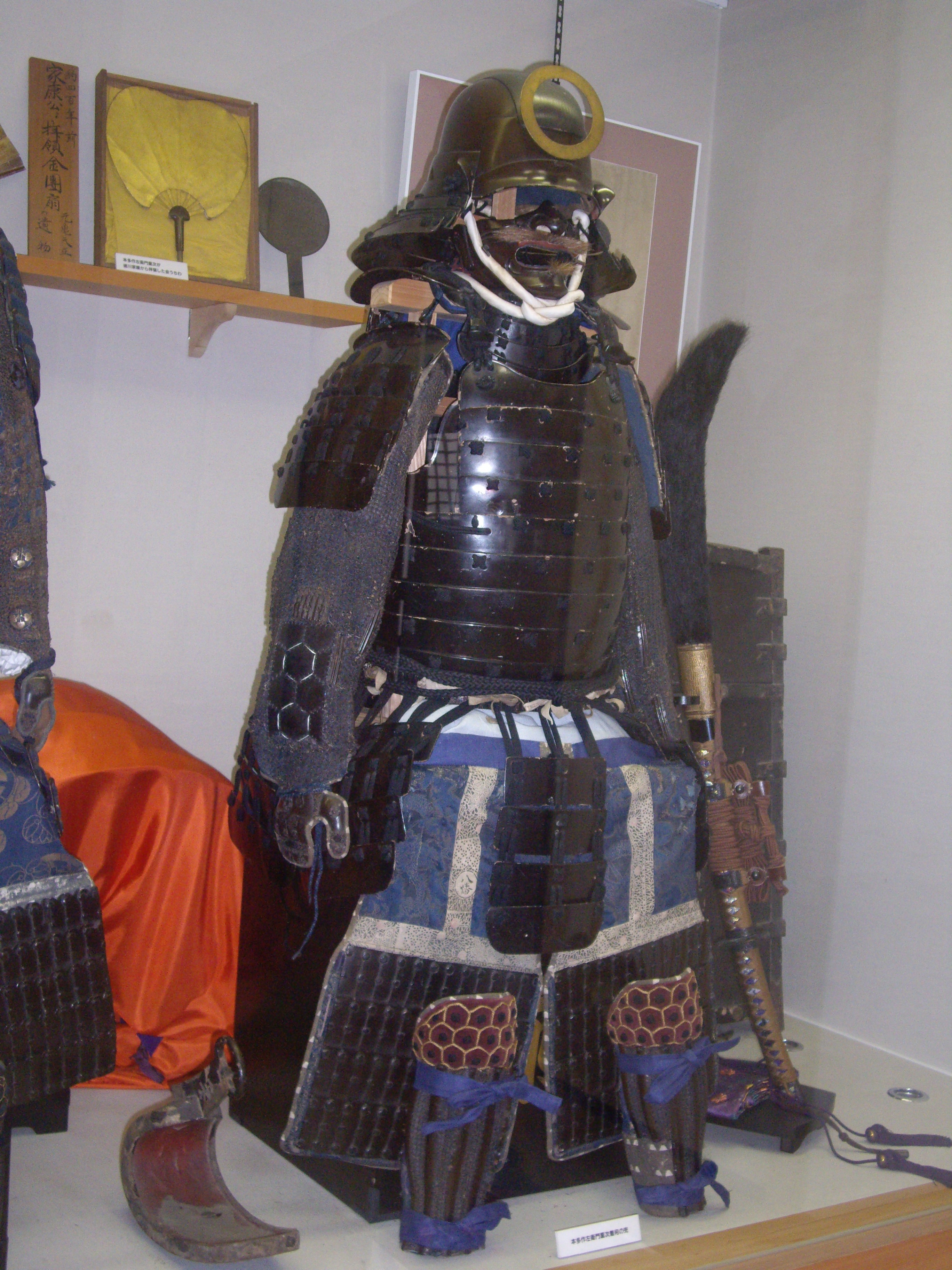 ▲本願寺に保存され居てる重次着用の武具。兜の左側面には弾丸跡がある。